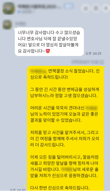 “너무너무 감사합니다. 수고 많으셨습니다. 변호사님 덕에 잘 끝낼 수 있었어요! 앞으로 더 열심히 잘 살아볼게요 감사합니다”